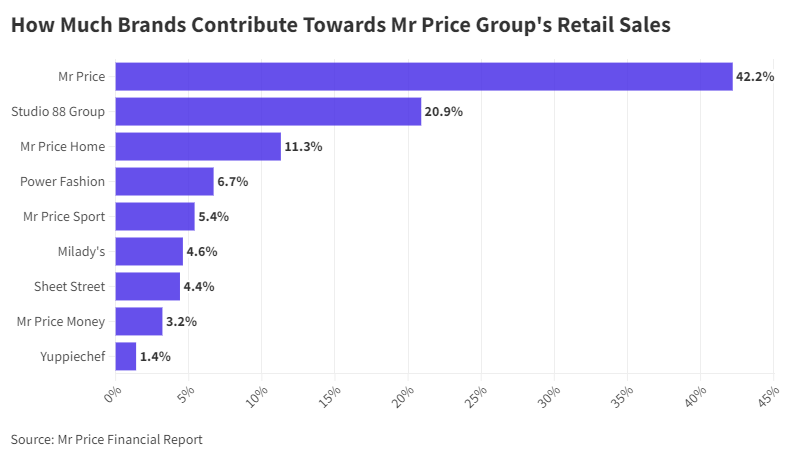 Below we see that the driving force behind the Group’s stellar financial performance is understandably Mr Price, Mr Price Home & Mr Price Sport- collectively contributing 58.9% of the Group’s retail sales.
