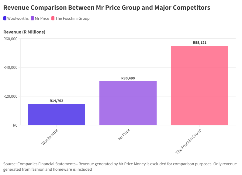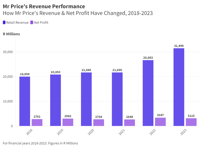 In comparison, Woolworth’s Fashion, Beauty and Home division net profit margin in 2023 was approximately 8%. Benchmarked against Woolworths and the Foschini Group, Mr Price is in second place. Mr Price’s revenue (excluding revenue from Mr Price Money) was double Woolworth’s in 2023 (R30.4 Billion* vs R14.8 Billion). However, the Foschini Group’s revenue is 1.7 times more than Mr Price’s.