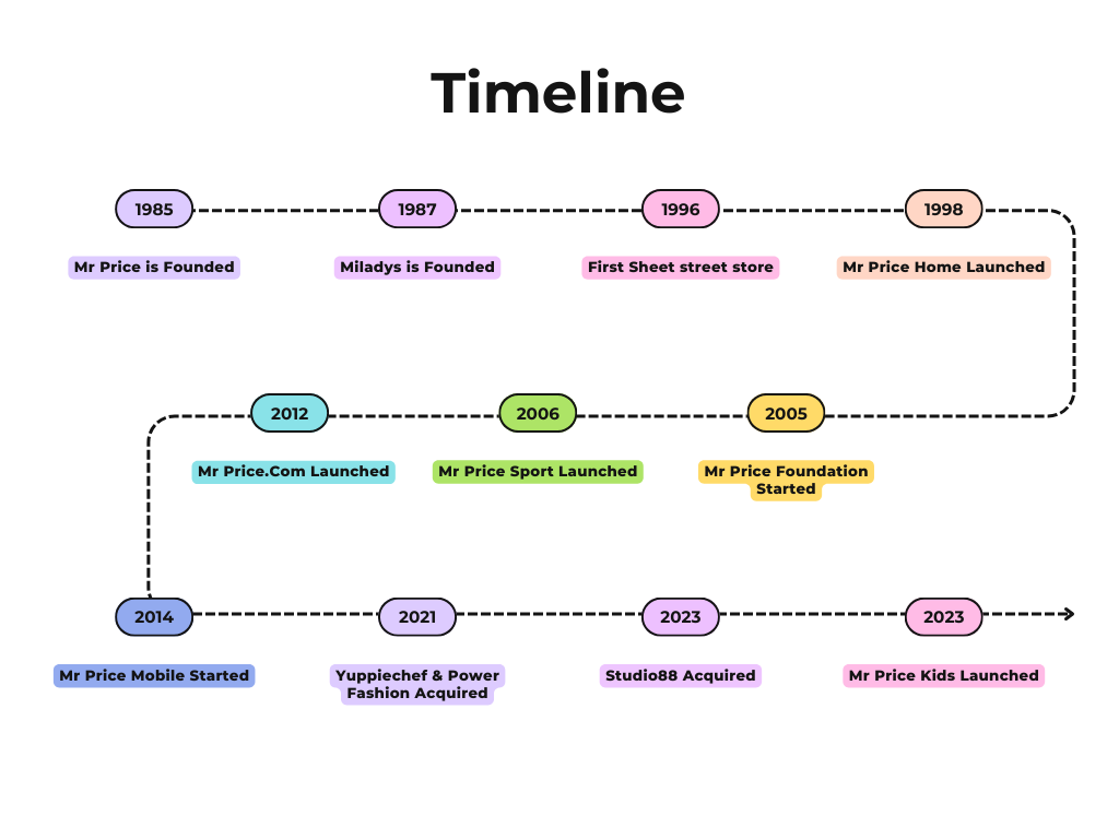 Birthed by Laurie Chiappini and Stewart Cohen in 1985, Mr Price is a good example of what is possible when people who dare to dream actually launch into the unknown. What started as a small apparel store has now grown into a retail behemoth spanning across segments such as homeware, financial services, and telecommunications. Its phenomenal growth is due to the incorporation of both organic and inorganic growth strategies. Despite its success, Mr Price Group has ensured it hasn’t strayed away from its founders’ vision of providing quality products at affordable prices. This is an example of having unwavering conviction about your strategy- no matter the shifts, disruptions and challenges you have, don’t compromise when it comes to your core. Below is a timeline of significant events since 1985.